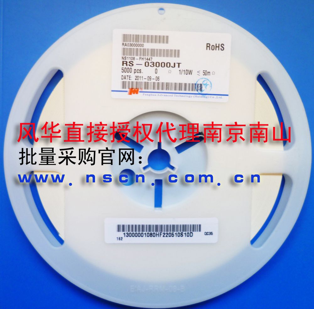 风华高科(FH)代理商南京南山半导体有限公司代理供应风华高科(FH)常规贴片电阻全系列产品。风华贴片电阻规格型号RS-03000JT是阻值0RR0603封装J(5%)精度的常规型号。南京南山半导体在南京总部和深圳备有大量现货库存,欢迎拨打风华代理南京南山全国咨询服务电话或咨询在线客服。