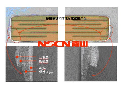在破坏性的抗折板测试中,PCB板将持续弯曲直到贴片电容产生破坏为止,在这种模拟比较实验中,可以发现具有柔性端头设计的产品中,没有在陶瓷结构中产生裂缝,而是从弹兴银层产生撕裂现象。
