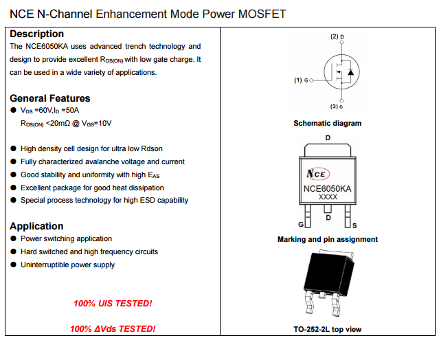 大家好 ,今天给大家介绍一款适用于60V电动车控制器的可替代国外型号的MOS管NCE6050KA。场效应管NCE6050KA是一款60V漏源电压,50A电流,TO-252封装的N沟道MOS管,说到60V和50A,我想甚至连不太接触电子元器件的人也有点熟悉,好像在哪里见过,相信大家都买过电动车,一般买的时候肯定听过电动车是60V或者48V的。NCE6050KA就是一款适用于60V电动车控制器的场效应管。目前在60V电动车控制器的应用中,MOS管主要损耗包括开关损耗(开通过程和关断过程),导通损耗,截止损耗(漏电流引起的,这个忽略不计),还有雪崩能量损耗。只要把这些损耗控制在MOS管承受规格之内,MOS管即会正常工作。所以选取一款合适的MOS管是很有必要的,常用的60V电动车控制器有捷捷微的JMTK50N06B,新洁能的NCE6050KA,都是不错的选择,近期市场上NCE6050KA貌似很受青睐,我们南山电子就备有库存,下面就给大家分享下60V电动车控制器的常用型号NCE6050KA的规格书: