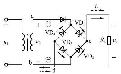 在交流电压正半周时,VD1导通,VD3导通。所以电流从a点经VD1再到c点,流过负载Rl,通过VD3流回b。而在电压负半周时,VD2与VD4导通,电流从b点流经VD2,经过c点,流过负载,通过VD4流回a点。这样无论输入端在正半周还是负半周,输出端都是单一的方向。如下图