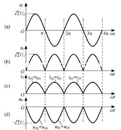 桥式整流克服了半波整流波形不连续的缺点,由四个二极管构成电桥。如下图