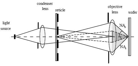 物体成像是由物镜收集到的各级衍射光相长干涉的结果。当物镜收集到的衍射光级次越高时,衍射光包含的光掩模图形信息越丰富,成像的质量越高。由于物镜数值孔径大小的限制,不能收集到所有高级次的衍射光,而要使物体成像,物镜系统起码要收集到光掩模图形衍射的零级光和一级光。随着光掩模图形尺寸的减小,根据布拉格定律,衍射角会变得越大,当光掩模图形的尺寸减小到一定程度时,物镜系统不能收集到其一级衍射光,此时光掩模图形将无法成像,因此提出了物镜系统所能成像的最小线宽即分辨率(Resolution)的概念。
