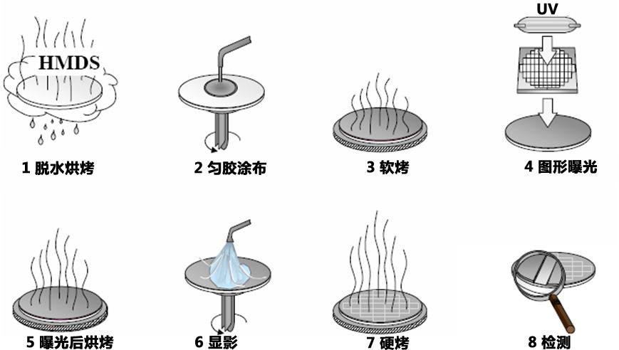 对于正性光刻胶,为了获得平坦而均匀的光刻胶涂层并且使光刻胶与晶圆之间有良好的粘附性,通常在涂胶之前必须对晶圆进行预处理。预处理的第一步常常是一次脱水烘烤,在真空或干燥氮气的气氛中,以150~200℃烘烤。该步的目的是除去晶圆表面吸附的水分,在此温度下,晶圆表面大概保留下一个单分子层的水。